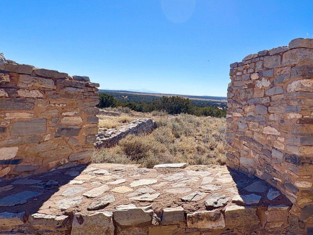 Turned southward at Moriarity after a breakfast burrito at Blakes. Headed through Estancia as the day warmed up. Briefly visited the Gran Quivera ruins, the southernmost unit of the Salina’s Pueblo Mission Monument. Remote doesn’t adequately describe this place. It was once a busy stop on the “salt trail,” for burdened people and animals carrying loads of salt from the lakes east of Estancia. Today I am alone and the visitor center is closed and locked. They’ve built a wheelchair ramp up directly to the remains of the church that is – noticeable. It was windy. I drove on.