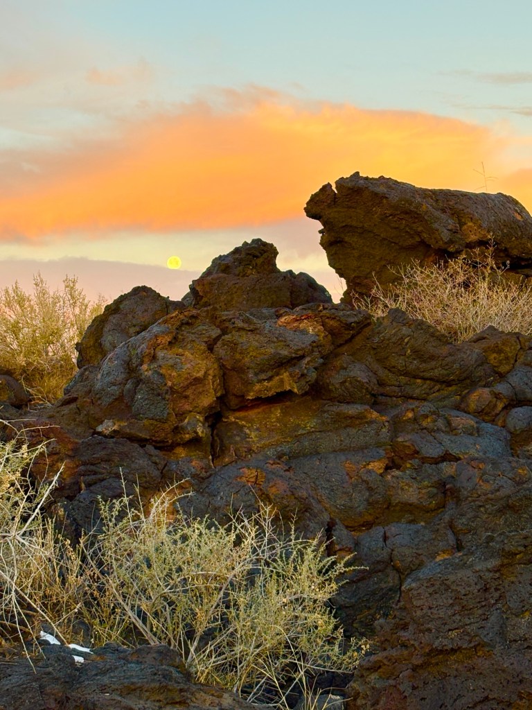 Sitting in my tent waiting for the full moon to rise as the temperature drops. The black rock looms over my tent site in the Valley of Fires campground. The lava is so young it looks like it could begin flowing again tonight. Birds sing in the dark on the edge of the campfire. Otherwise it’s quiet until a freight train roars through Carrizozo.